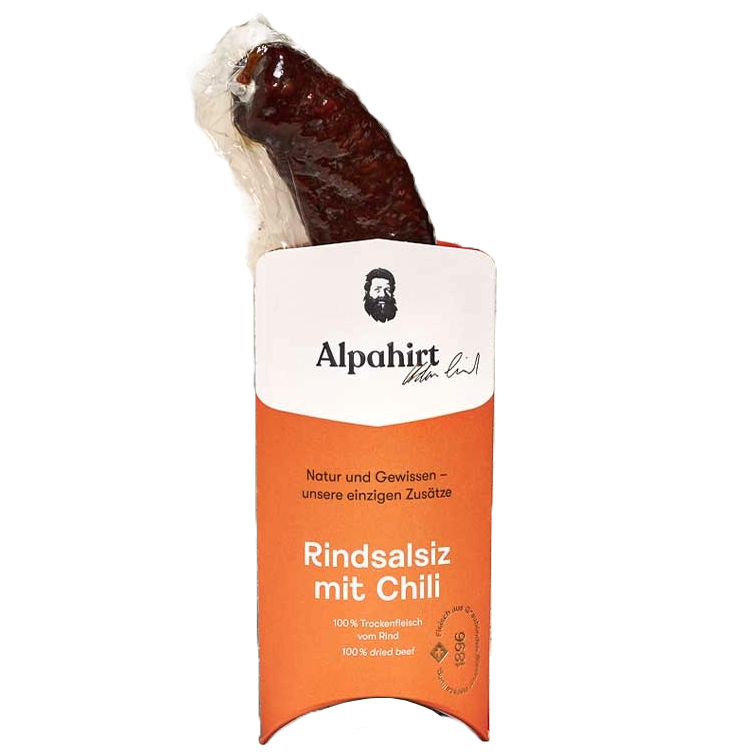 Bœuf de montagne, vin, sel alpin, épices, 0,5% piment des Grisons, boyau naturel à base d'intestin de bœuf.
